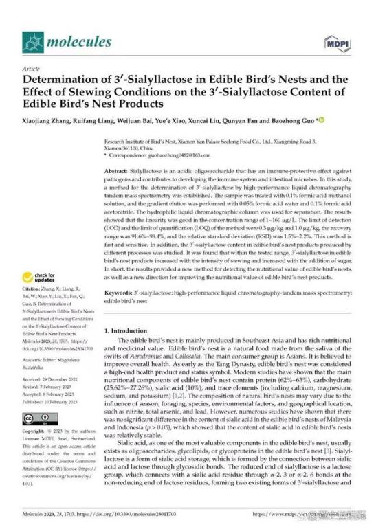 科技創(chuàng)新是產(chǎn)業(yè)發(fā)展的重要源泉和動力。多年來,燕之屋堅持傳承中國滋補文化的同時,結(jié)合現(xiàn)代科研技術(shù)深入研究,充分挖掘燕窩的營養(yǎng)價值及功效?,F(xiàn)代研究發(fā)現(xiàn),“燕窩富含蛋白質(zhì)、氨基酸、唾液酸和無機元素等,具有抗氧化、改善免疫、抑制血凝、調(diào)節(jié)腸道菌群等功效(來自:白偉娟等.《燕窩成分及功效研究進展》,2020)。”在燕之屋燕窩研究院科研團隊新近發(fā)布的研究成果中,基于開創(chuàng)性地建立的燕窩中3'-唾液酸乳糖的LC-MS/MS測定方法,及兩年的跟蹤研究發(fā)現(xiàn)3'-唾液酸乳糖作為一種更容易吸收的唾液酸形態(tài),適當(dāng)?shù)臒踔笥兄谘喔C中的唾液酸向更易吸收的3'-唾液酸乳糖的形態(tài)轉(zhuǎn)化。研究表明,“碗燕產(chǎn)品中3'-唾液酸乳糖含量顯著高于家庭燉煮燕窩(100℃ 30min)(來自:國際權(quán)威期刊《Molecules》,Determination of 3'-Sialyllactose in Edible Bird's Nests and the Effect of Stewing Conditions on the 3'-Sialyllactose Content of Edible Bird's Nest Products)。”如燕之屋旗下高端燕窩品牌碗燕飛天款的3'-唾液酸乳糖含量相對于于燉煮燕窩高達20余倍,表明燕之屋專利燉煮工藝(專利號:ZL201410393800.4 ;專利名稱:一種速食燕窩軟罐頭的制作方法)能夠激發(fā)燕窩的營養(yǎng)活性,提升燕窩產(chǎn)品的營養(yǎng)價值(來自:燕之屋燕窩研究院,碗燕產(chǎn)品五維營養(yǎng)分析報告)。”此外,燕之屋燕窩研究院科研團隊一直以來燕之屋始終堅持走“研發(fā)立企、創(chuàng)新興企”之路,基于研究成果不斷對產(chǎn)品進行升級和創(chuàng)新,致力于為消費者打造更為科學(xué)、營養(yǎng)、健康的產(chǎn)品。截止至2023年8月1日,燕之屋發(fā)表論文共計44篇,其中SCI 11篇。