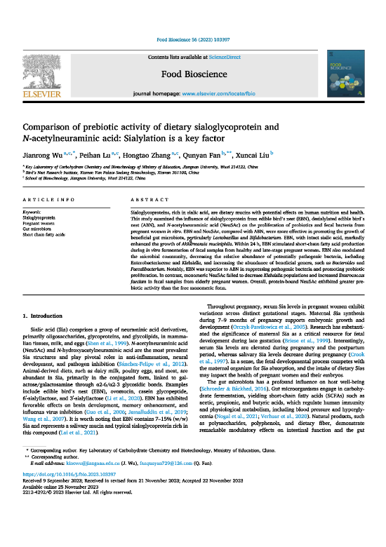 近日,燕之屋聯(lián)合江南大學(xué)發(fā)表“Comparison of prebiotic activity of dietary sialoglycoprotein and N-acetylneuraminic acid: Sialylation is a key factor”的研究成果被食品科學(xué)領(lǐng)域國際知名SCI期刊《Food Bioscience》收錄,該研究揭示了燕之屋鮮燉燕窩促進(jìn)益生菌增殖與調(diào)節(jié)腸道微生物群的作用。
