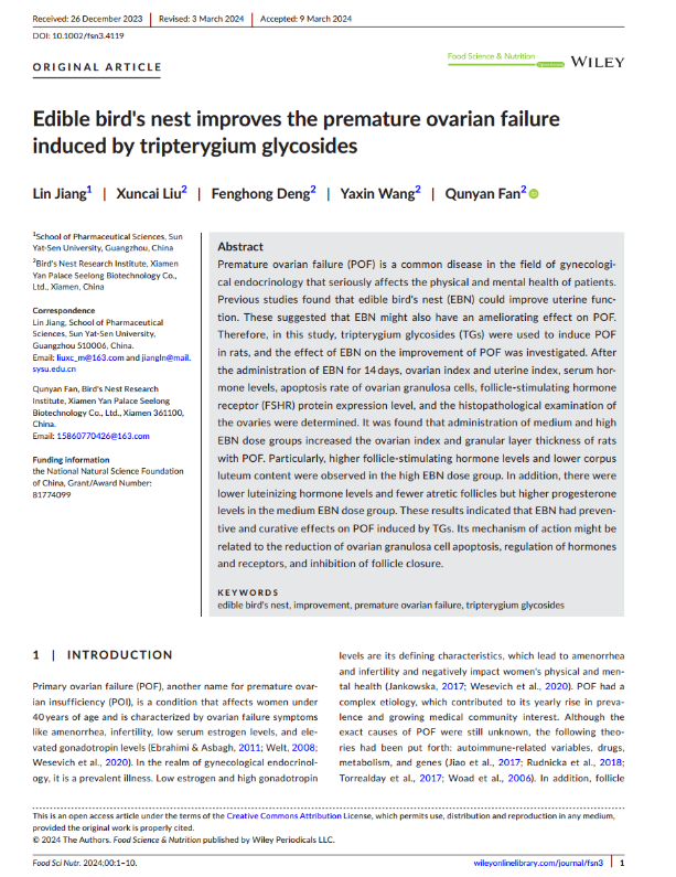 燕之屋“Edible bird's nest improves the premature ovarian failure induced by tripterygium glycosides”科研成果被食品科學(xué)領(lǐng)域國(guó)際知名SCI收錄期刊《Food Science & Nutrition 》所收錄和發(fā)表,是燕之屋在科研領(lǐng)域的卓越表現(xiàn),凸顯了燕之屋在食品科學(xué)領(lǐng)域的深厚積淀。燕之屋將持續(xù)增強(qiáng)研發(fā)、創(chuàng)新能力,深入挖掘食品科學(xué)潛力,提升企業(yè)核心競(jìng)爭(zhēng)力,以期在科技創(chuàng)新領(lǐng)域取得更大突破。