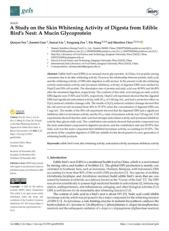 燕之屋潛心燕窩肽研究,成立燕之屋燕窩肽研究中心,聚焦燕窩肽酶解技術(shù)、活性成分與功能研究等多方向賽道,近年來不斷取得突破,成果斐然。2021年,燕之屋燕窩研究院和江南大學(xué)食品科學(xué)與技術(shù)國家重點實驗室聯(lián)合完成研究成果“A study on the skin whitening activity of digesta from edible bird's nest: A mucin glycoprotein”,發(fā)布于權(quán)威學(xué)術(shù)性期刊《Gels》;2022年,燕之屋燕窩研究院攜手香港科技大學(xué)攜手完成燕窩肽抗皮膚炎癥功能研究,專業(yè)研究成果“Edible bird’s nest, an Asian health food supplement, possesses anti-inflammatory responses in restoring the symptoms of atopic dermatitis: An analysis of signaling cascades”發(fā)布于權(quán)威學(xué)術(shù)性期刊《Frontiers in Pharmacology》;2023年,燕之屋燕窩研究院通過體外生化、細(xì)胞、生物三維立體證實了燕窩肽的抗衰老功效,并在國際權(quán)威期刊《Journal of Functional Foods》發(fā)表了燕窩肽抗衰研究"Study of the antiaging effects of bird's nest peptide based on biochemical, cellular, and animal models",揭示燕窩肽抗衰老功效,再一次為燕窩肽的研究發(fā)展貢獻有利價值。近日,燕之屋“一種具有促進細(xì)胞修護、高保濕美白功效的燕窩肽制備方法及應(yīng)用”獲得國家知識產(chǎn)權(quán)局發(fā)明專利授權(quán)(專利號:ZL 2022 1 1398048.3),充分證明燕之屋在燕窩肽領(lǐng)域的引領(lǐng)地位。